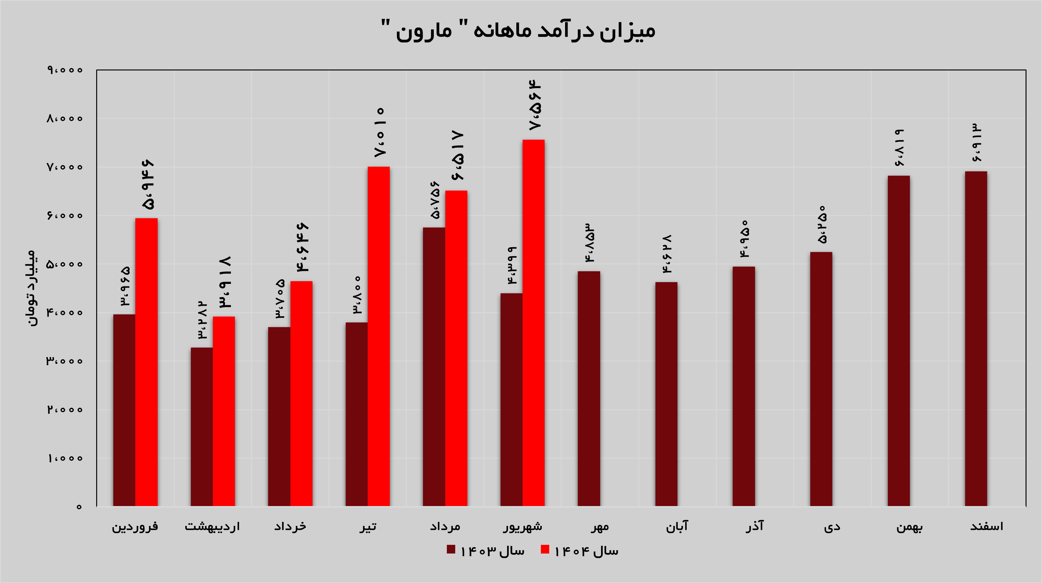 در ششمین ماه سال ۱۴۰۴، شرکت پتروشیمی مارون موفق به کسب درآمدی معادل ۷ هزار و ۵۶۴ میلیارد تومان از فروش محصولات خود در بازار‌های داخلی و خارجی شد.