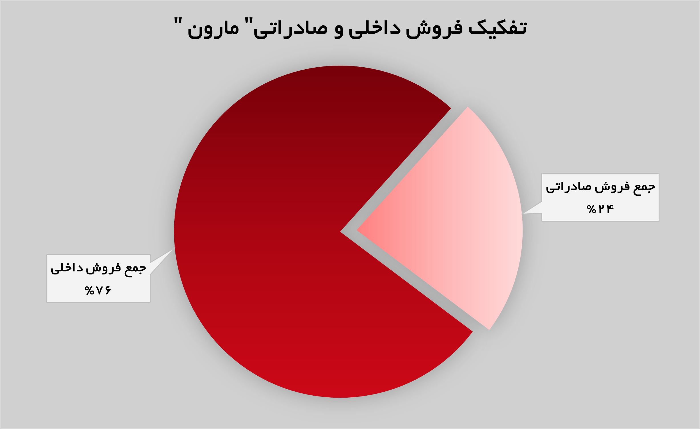 درآمد یاد شده حاصل از فروش محصولات “مارون” در بازار داخلی و خارجی بوده که در این بین، سهمی ۷۶ درصدی را از فروش محصولات آن در بازار داخلی تصاحب کرده است. با این وجود، فروش محصولات پتروشی مارون در بازار داخلی برابر با ۵ هزار و ۷۷۹ میلیارد تومان به ثبت رسیده است. اما سهم “مارون” از فروش محصولات در بازار خارجی ۲۴ درصد بوده که معادل یک هزار و ۷۸۵ میلیارد تومان است.