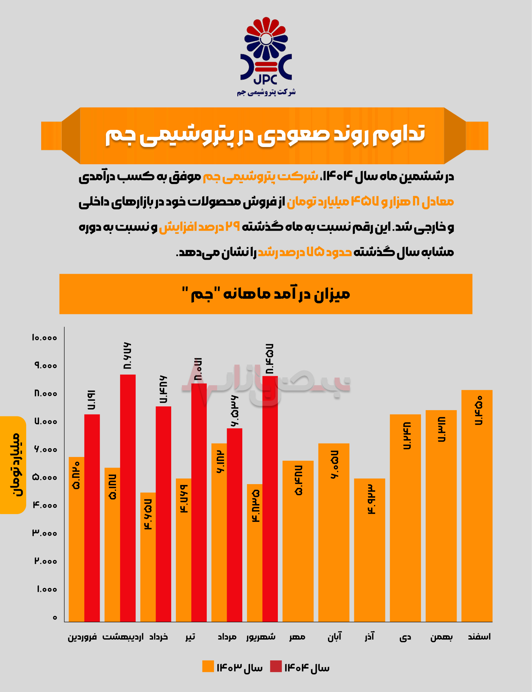 در ششمین ماه سال ۱۴۰۴، شرکت پتروشیمی جم موفق به کسب درآمدی معادل ۸ هزار و ۴۵۷ میلیارد تومان از فروش محصولات خود در بازارهای داخلی و خارجی شد.