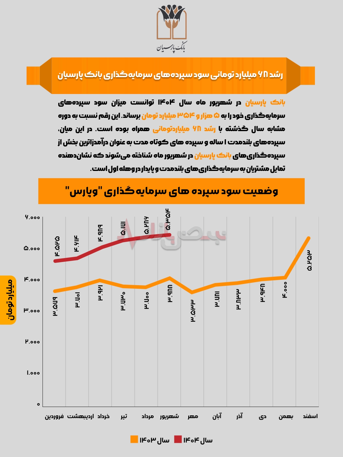 بانک پارسیان در شهریور ماه سال ۱۴۰۴ توانست میزان سود سپردههای سرمایهگذاری خود را به ۵ هزار و ۳۵۴ میلیارد تومان برساند.