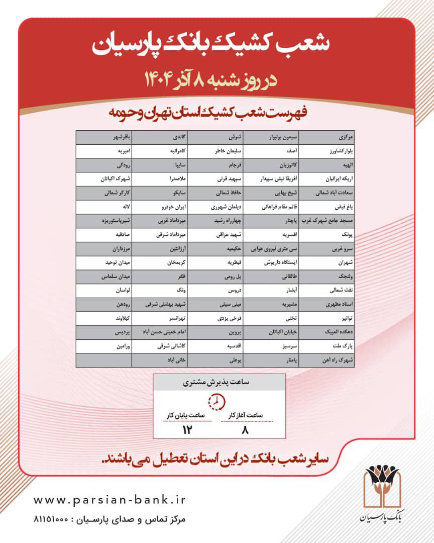 تعطیلی شعب بانک پارسیان در استان تهران در روز شنبه هشتم آذرماه