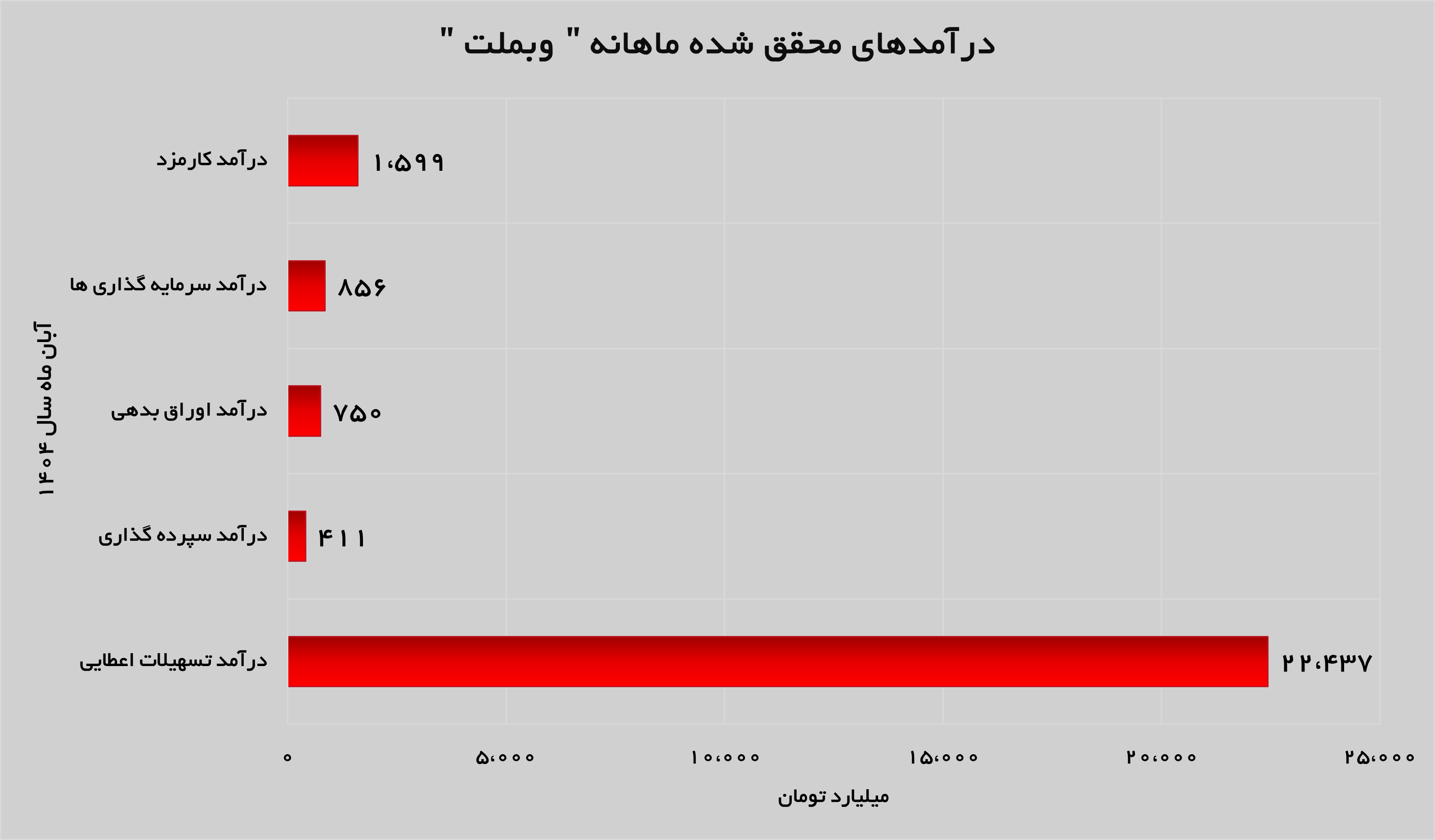 در جزئیات بیشتر، “وبملت” موفق به کسب درآمدی معادل ۲۲ هزار و ۴۳۷ میلیارد تومان از بخش تسهیلات اعطایی، ۴۱۱ میلیارد تومان از بخش سپرده‌گذاری، ۸۵۶ میلیارد تومان از سرمایه گذاری، ۸۵۶ میلیارد تومان از اوراق بدهی و یک هزار و ۵۹۹ میلیارد تومان از کارمزد‌ها شده است.