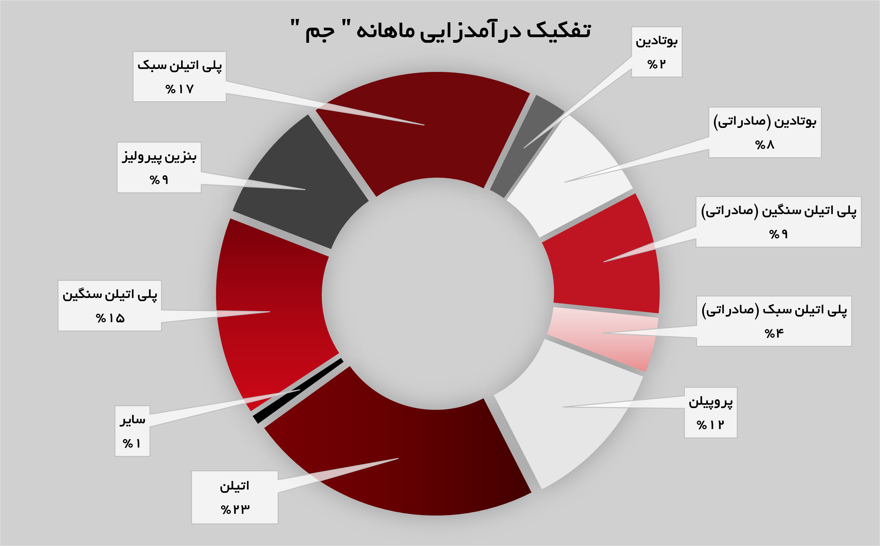 پس از این محصول، «پلی اتیلن سبک (داخلی)» با درآمد یک هزار و ۲۸۷ میلیارد تومانی در جایگاه دوم قرار دارد که سهم ۱۷ درصدی از کیک درآمدی “جم” را به خود اختصاص داده است.