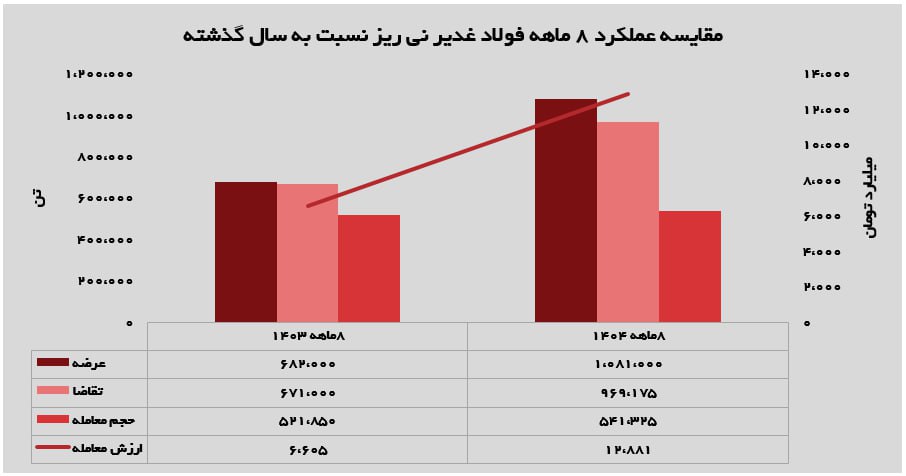 فراتر از عملکرد ماهانه، دادههای هشتماهه نخست سال ۱۴۰۴ نیز تصویری بسیار قدرتمند از وضعیت عملیاتی شرکت ارائه میدهد. مجموع عرضههای نیریز از ابتدای سال تا پایان آبان به یک میلیون و ۸۱ هزار تن رسیده که رشد ۵۹ درصدی نسبت به دوره مشابه سال گذشته را رقم زده است. در بخش تقاضا نیز شرکت رشد ۴۴ درصدی را ثبت کرده است؛ موضوعی که بیانگر تعمیق جایگاه رقابتی نیریز در بازار داخلی و استمرار اعتماد خریداران اصلی است.