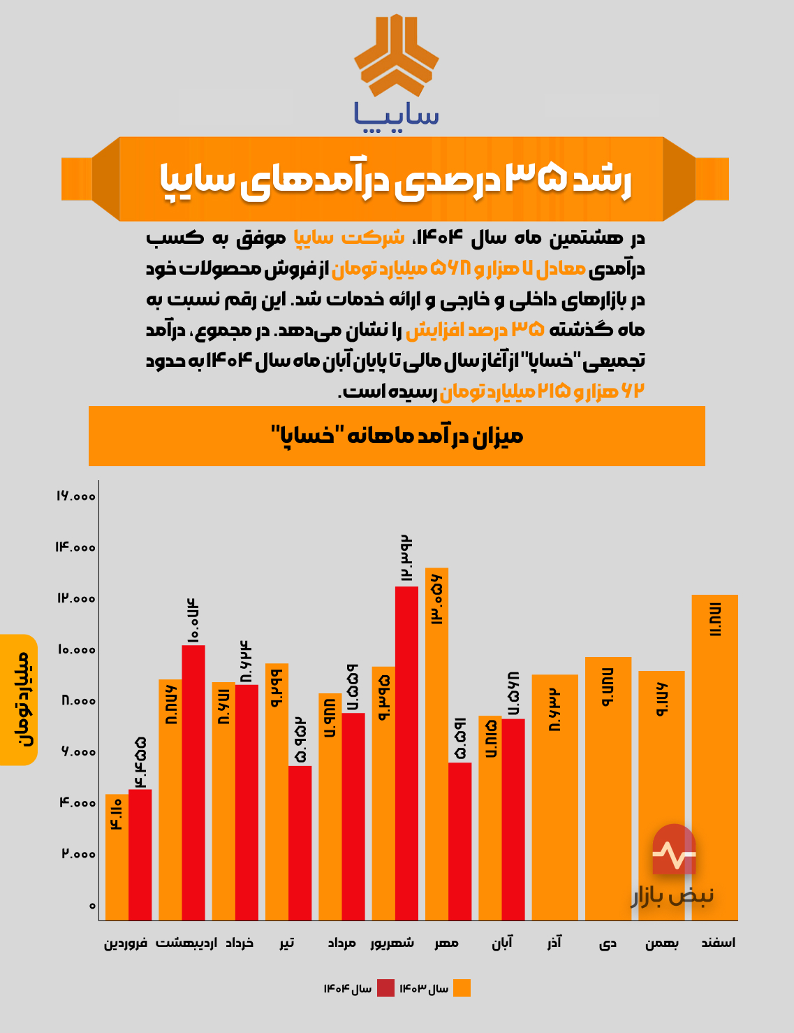 در مجموع، درآمد تجمیعی “خساپا” از آغاز سال مالی تا پایان آبان ماه سال ۱۴۰۴ به حدود ۶۲ هزار و ۲۱۵ میلیارد تومان رسیده است.